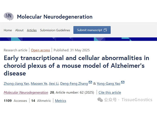 阿尔茨海默病(AD)是一种进行性神经退行性疾病,其特征为 β 淀粉样蛋白(Aβ)斑块沉积、 tau 蛋白过度磷酸化以及神经炎症。脉络丛(ChP)作为血 - 脑脊液屏障,在应激免疫反应和脑内稳态维持中发挥关键作用。然而,脉络丛在 AD 进展中的细胞与分子机制仍未被充分阐明。2025 年 5 月 31